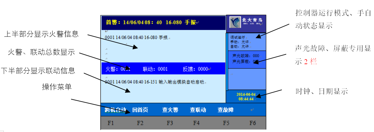 控制器采用7英寸真彩液晶屏,顯示語(yǔ)言支持中英文切換,每條報(bào)警信息可顯示32個(gè)字符(16個(gè)漢字);顯示屏分為上下兩部分顯示,上部顯示火警信息,下部顯示聯(lián)動(dòng)信息(啟動(dòng)、反饋)。如圖: