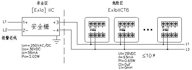使用時(shí)必須配接安全柵,每只安全柵后所帶防爆型手動(dòng)報(bào)警按鈕≤10只,每個(gè)報(bào)警回路使用安全柵的數(shù)量不得超過(guò)6只。